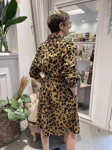 Abito chemisier in popeline di cotone con collo a polo, manica lunga con polso e bottone, cintura coordinata in vita.