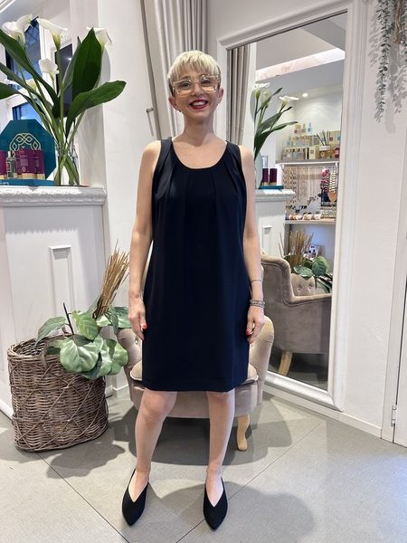 Abito a tubino corto e smanicato, fit comodo con girocollo e riprese.