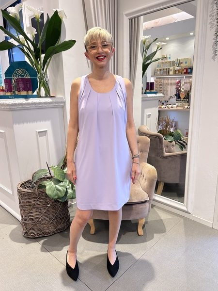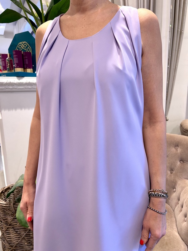 Abito a tubino corto e smanicato, fit comodo con girocollo e riprese.