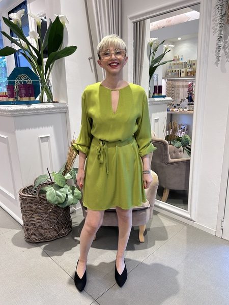 Abito corto in twill di viscosa, fit fluido con scollo tondo con apertura frontale a goccia, maniche lunghe con polsino elasticizzato e cintura coordinata in tessuto o con catena dorata in vita.