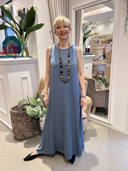 Abito lungo in acetato di viscosa lavato, linea svasata con scollo stondato, taglio verticale al centro sia sul davanti che sul retro e zip invisibile sul centro dietro.