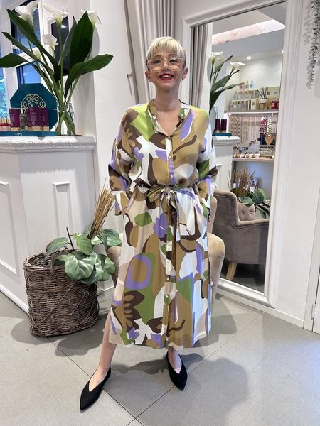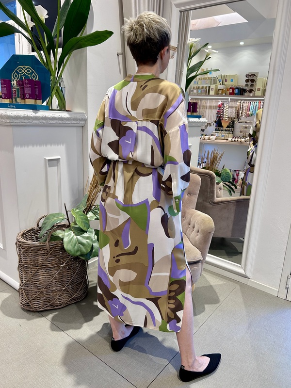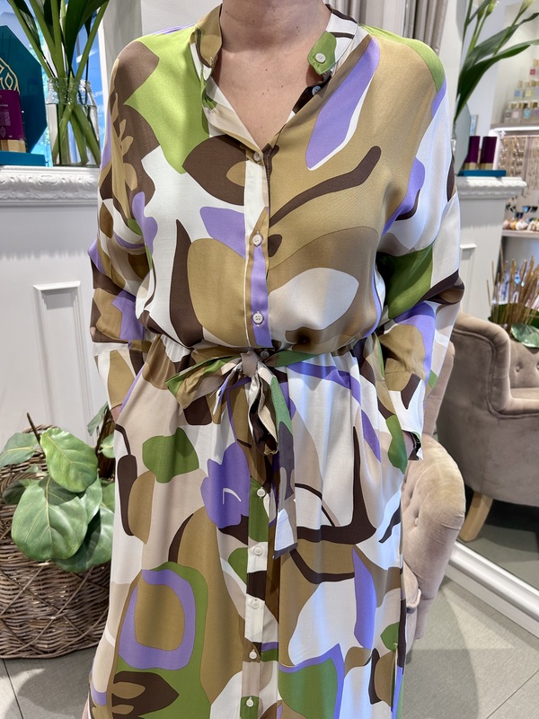 Abito lungo a chemisier in twill di viscosa, fit morbido con collo alla coreana, spala scesa, manica con polso largo, cintura coordinata in vita e chiusura con bottoni a vista.