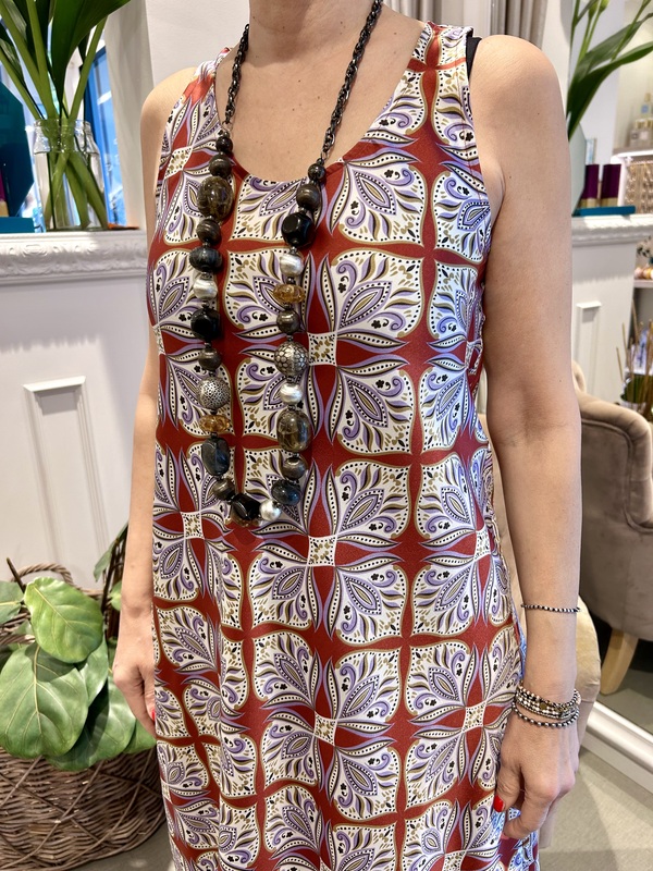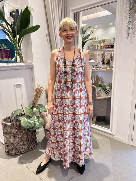 Abito lungo in twill con fantasia geometrica, linea svasata, scollo stondato e senza maniche.