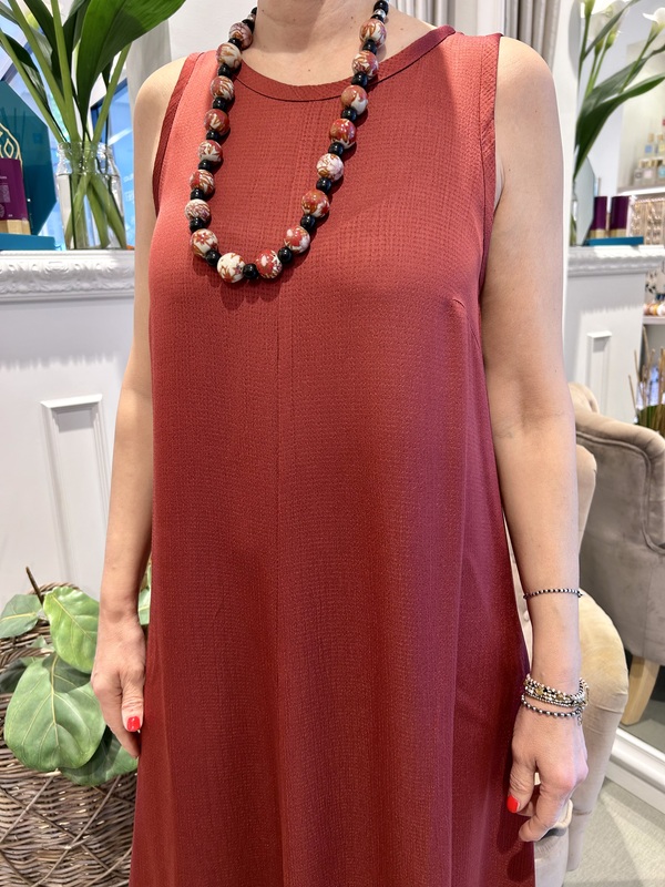 Abito lungo in acetato di viscosa lavato, linea svasata con scollo stondato, taglio verticale al centro sia sul davanti che sul retro e zip invisibile sul centro dietro.