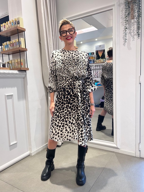 Abito in twill di viscosa a fantasia animalier con girocollo, maniche lunghe con arriccio e inserto elastico al polso, fusciacca che si annoda lateralmente in vita.