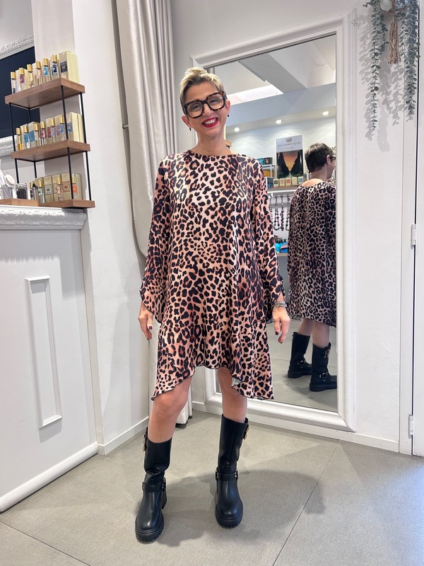 Abito corto a maniche lunghe ampie, linea svasata con punte sui lati e scollo a barchetta.