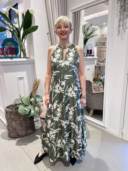 Abito midi in twill di seta, linea svasata con girocollo con apertura a V sul davanti e sul retro, giromanica leggermente all’americana e chiusura con bottone sul retro.