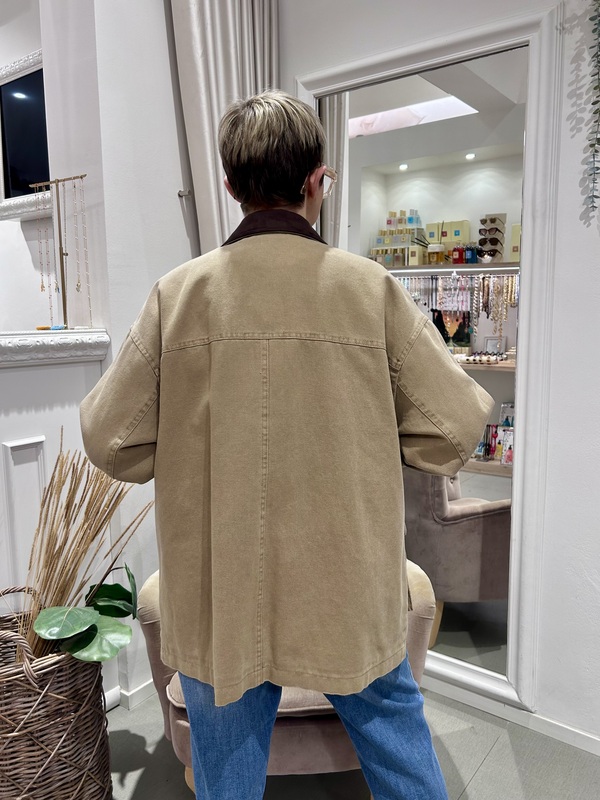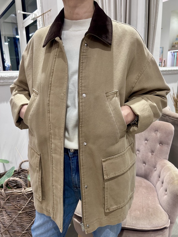 Giacca dalla vestibilità leggermente oversize, in cotone e dettaglio del collo in jersey vellutato. Chiusura con zip nascosta e bottoni a pressione.