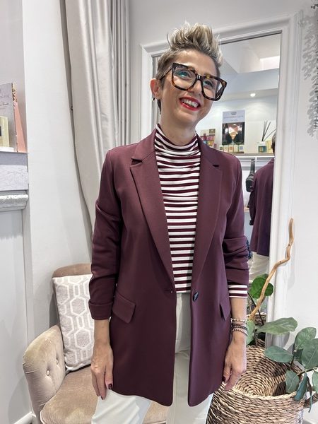 Blazer bordeaux in jersey stretch misto viscosa, fit dritto con scollo a rever e chiusura a monopetto con bottoni