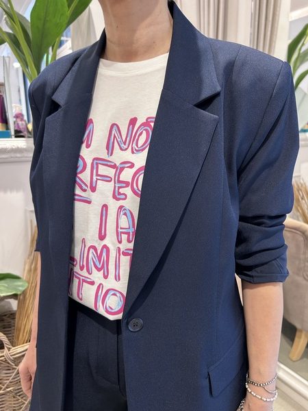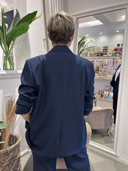 Blazer dritto, leggermente strutturato con rever, tasche frontali con patta e chiusura monopetto con bottone.