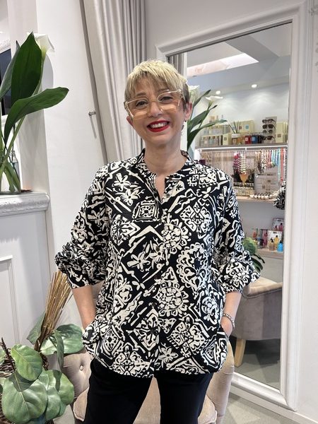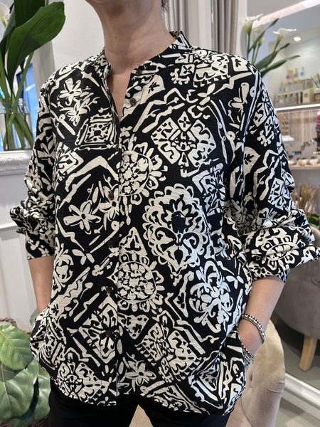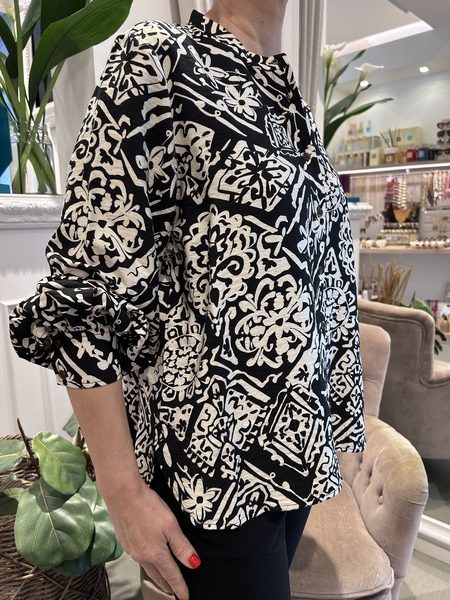 Blusa linea morbida con scollo alla coreana, manica a palloncino con polso, chiusura con bottoni.