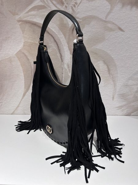Borsa a spalla con frange sui lati, chiusura a zip.