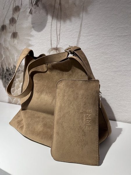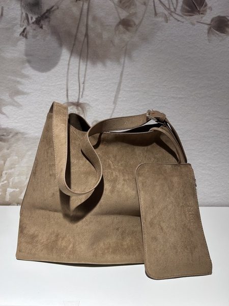 Borsa effetto scamosciato, linea morbida, con manico regolabile e pochette interna.