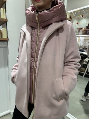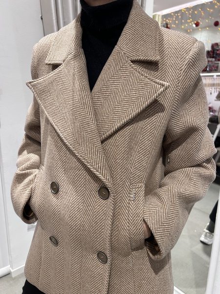 Cappotto corto, in tessuto spinato color beige e chiusura doppiopetto con bottoni.