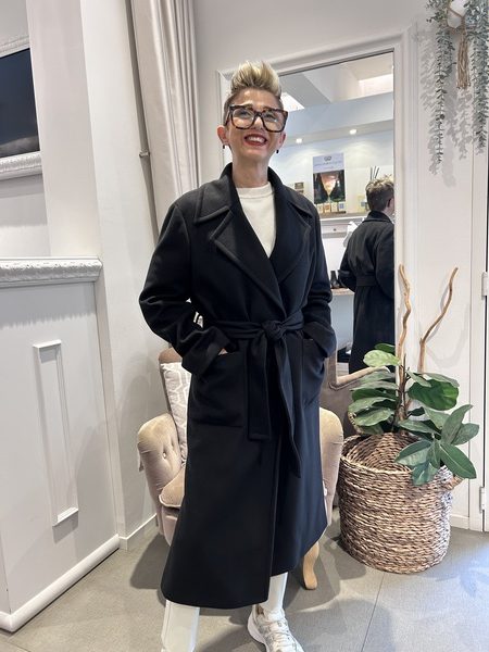Cappotto lungo foderato con collo a revers ampio, tasche applicate sul davanti, cintura coordinata in vita e chiusura frontale a vestaglia.