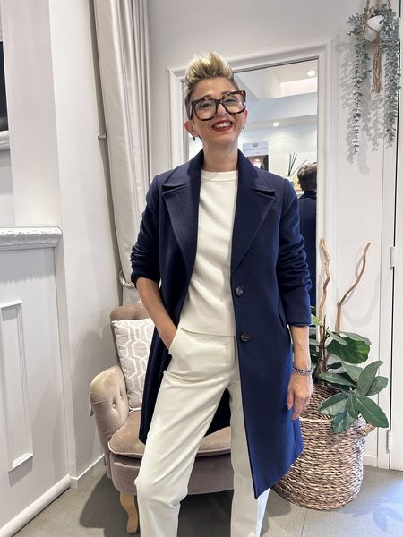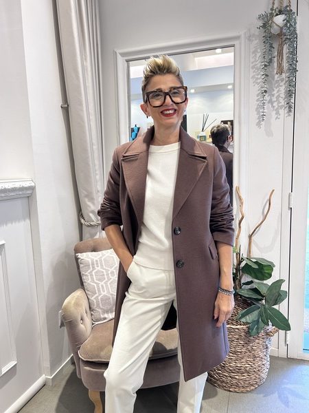 Cappotto linea sfiancata in lunghezza midi con collo a rever ampio, tasche laterali con pattina e chiusura frontale con bottoni.