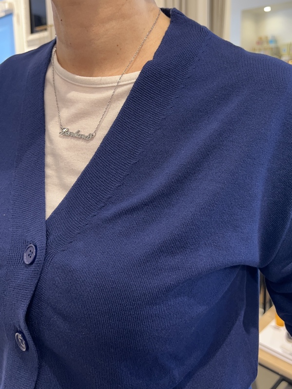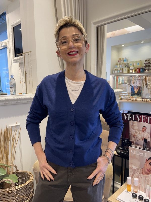 Cardigan con scollo a V profondo, chiusura con bottoni, color blu.