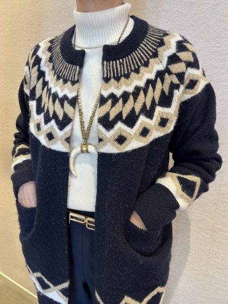 Cardigan over con girocollo, tasche laterali applicate e dettagli jacquard in filo lurex.