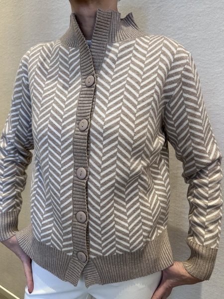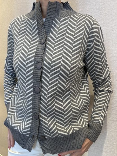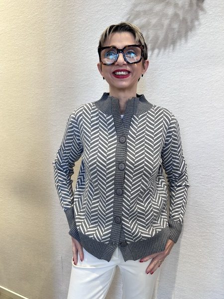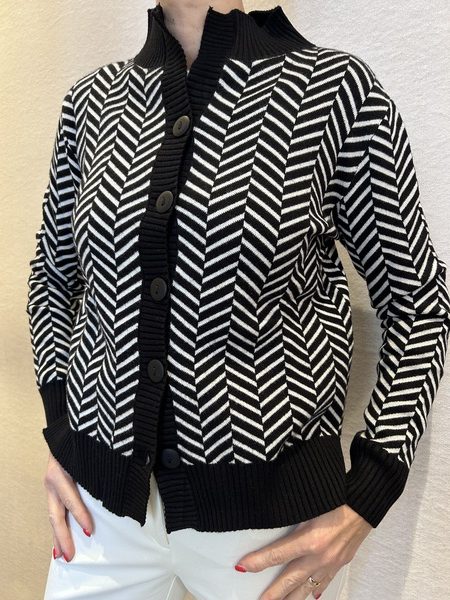 Cardigan corto a fantasia spigata in viscosa calda con collo alto morbido, chiusura con bottoni e fondo asimmetrico più lungo sul retro.