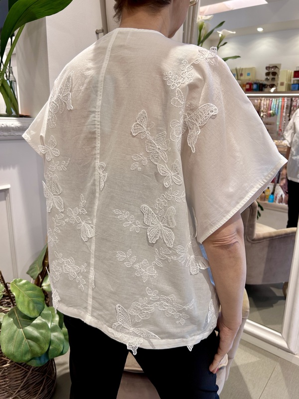Casacca in cotone, linea over con ricamo farfalle e fiori, manica a chimono e scollo a V.