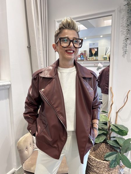 Giacca a chiodo in finta pelle con collo a rever, tasche laterali a filetto e alamari con bottone sulle spalle e chiusura doppio petto con zip.