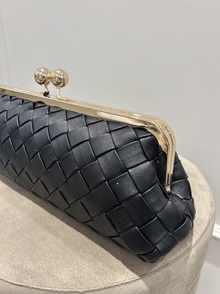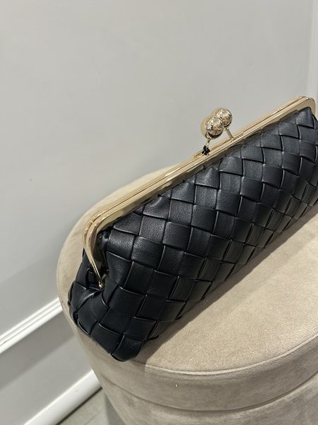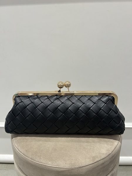 Borsa modello clutch, lavorazione intrecciata in color nero. Chiusura a scatto con sfere in metallo, tracolla cross-body rimovibile in catena di metallo.