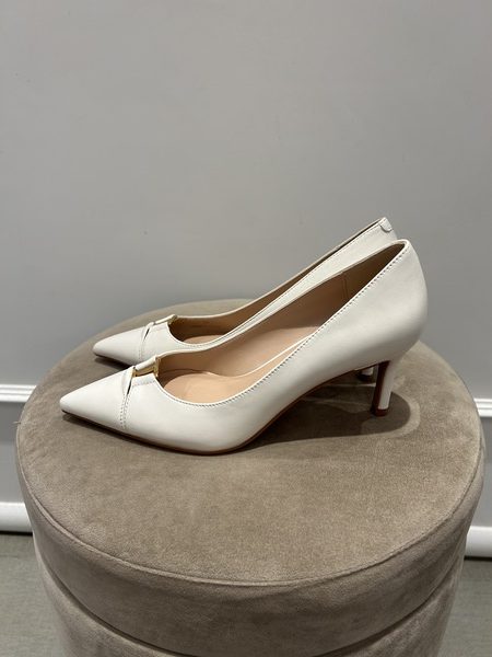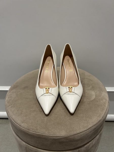 Décolleté in pelle bianca, dalla punta sfilata con logo in metallo, tacco a stiletto.