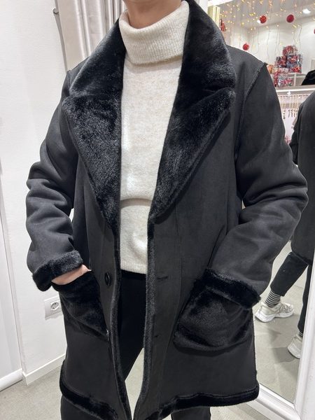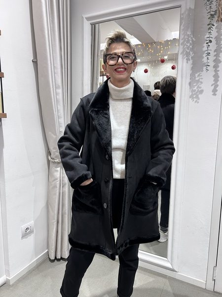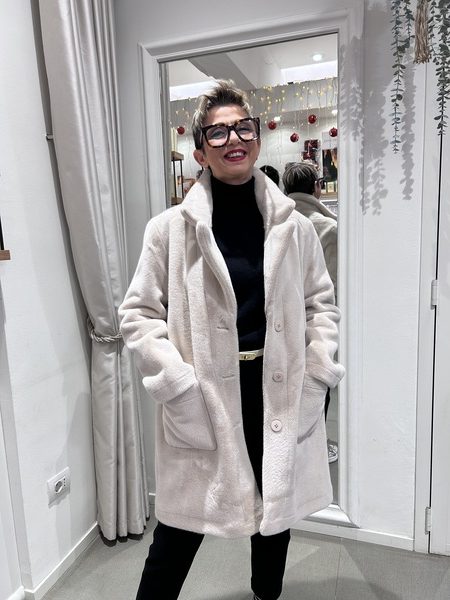 Cappotto midi in ecomontone, realizzato da un lato in ecopelliccia e dall’altro simil scamosciato. Ideato per essere indossato da entrambi i lati.
