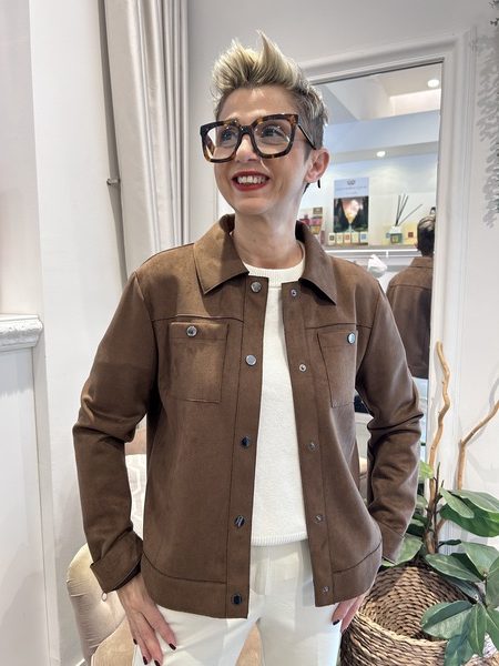 Giacca boxy fit in jersey stretch con finish vellutato, collo a camicia, tasche applicate sul davanti e chiusura con bottoni a pressione.