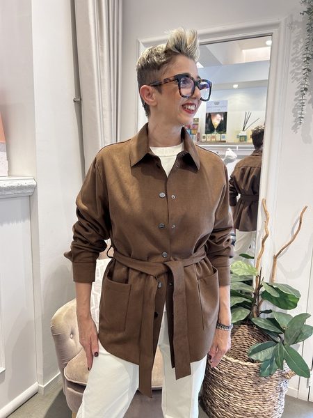 Giacca a camicia in jersey stretch con finish vellutato, linea dritta e morbida. Tasche applicate sul davanti, carré e cannoncino sul retro, cintura coordinata da annodare in vita e chiusura con bottoni a pressione.