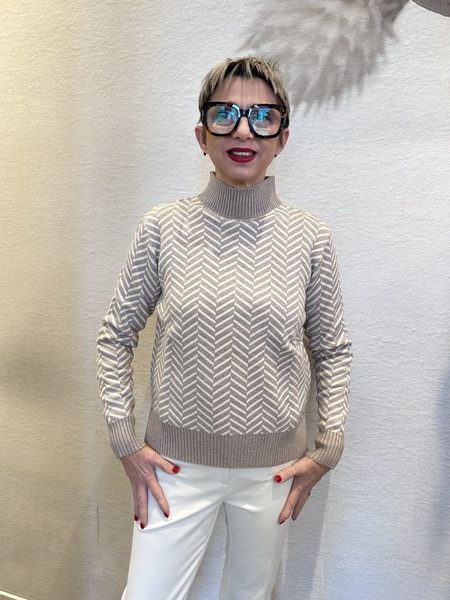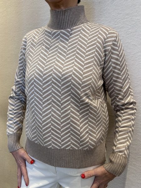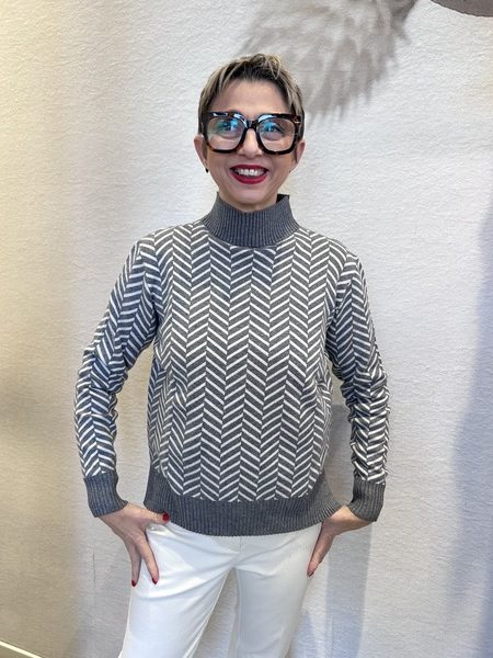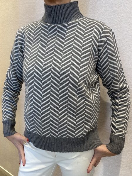 Lupetto a fantasia spigata in viscosa calda con collo alto morbido e fondo asimmetrico più lungo sul retro.
