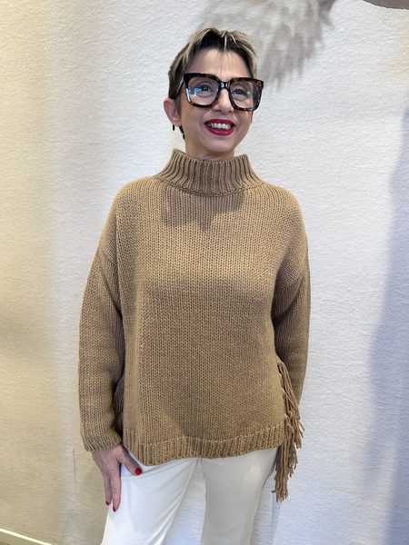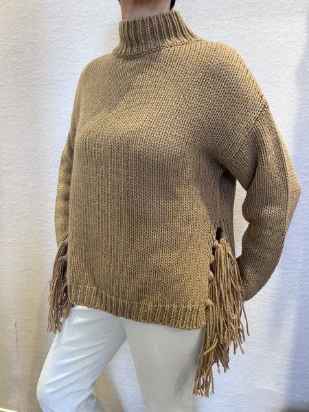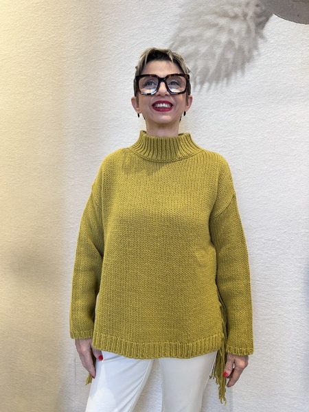 Maglia boxy in misto lana con collo alto, spalla scesa e spacchi laterali con trecce.