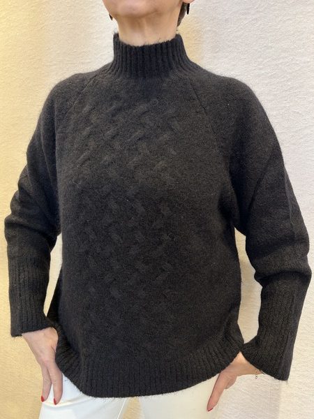 Maglia boxy in misto lana e mohair con collo alto, spalla scesa e dettaglio trecce sul davanti.