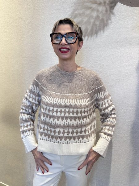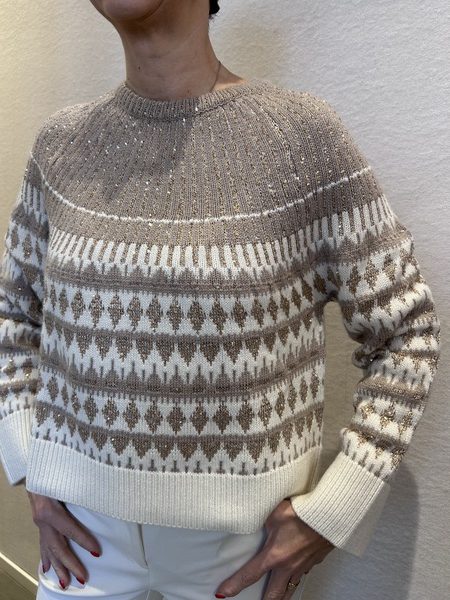 Maglia over in blend di lana con girocollo, maniche a raglan, bordi a costine, lavorazione jacquard e dettagli in filato con paillettes.