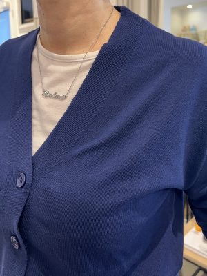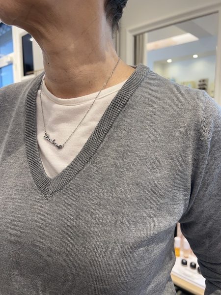 Maglioncino leggero color grigio, scollo a V, vestibilità regolare.