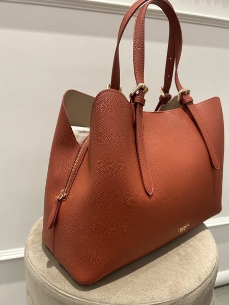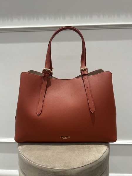 Maxi tote effetto pelle martellata color mattone, interno foderato color beige. Chiusura con magnete, all’interno vano centrale con chiusura a zip. Doppio manico da indossare a mano o a spalla, con fibbie regolabili.