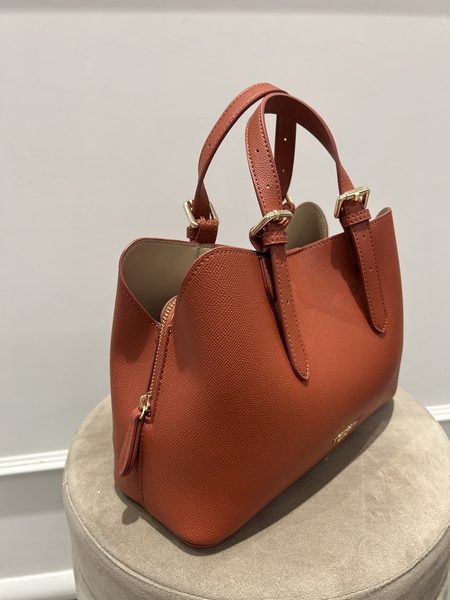 Mini tote effetto pelle martellata color mattone, interno foderato color beige. Chiusura con magnete, all’interno vano centrale con chiusura a zip. Doppio manico a mano con fibbie regolabili.