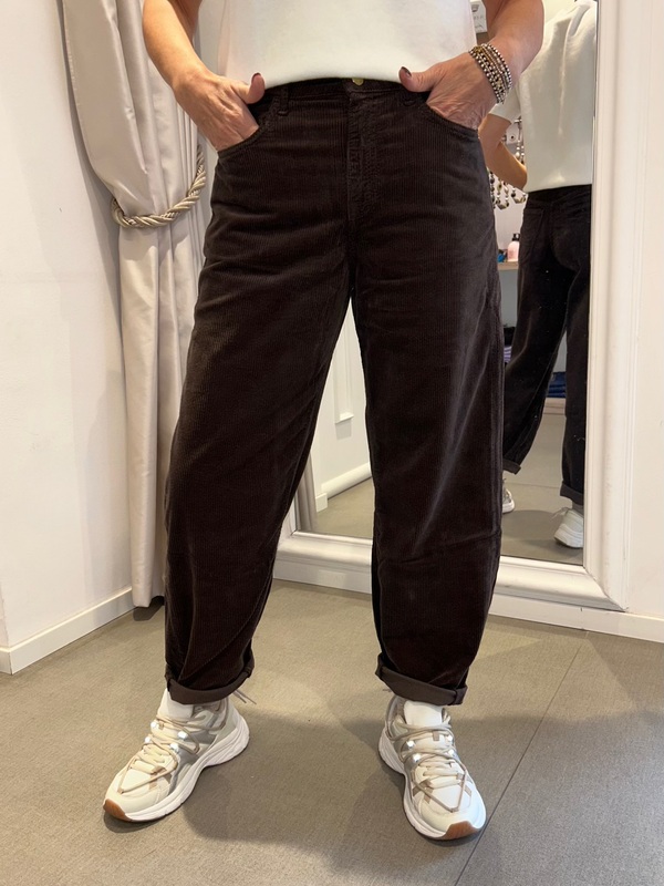Pantalone in velluto modello balloon con vita alta, tasche sul davanti e retro, chiusura con zip e bottone.
