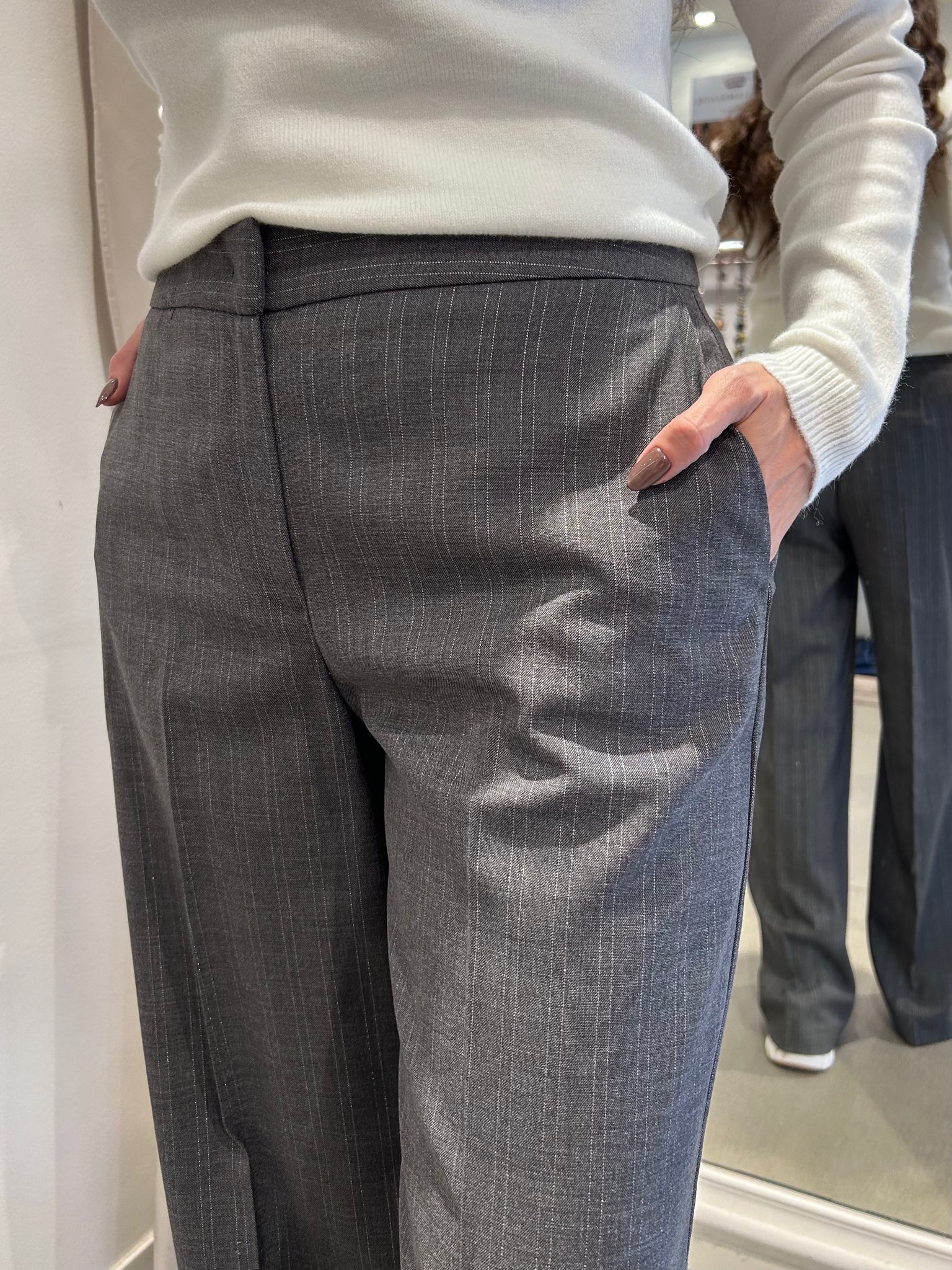 Pantalone a palazzo in stampa gessata con filo di lurex, tasche laterali alla francese, chiusura frontale con zip e gancetto.