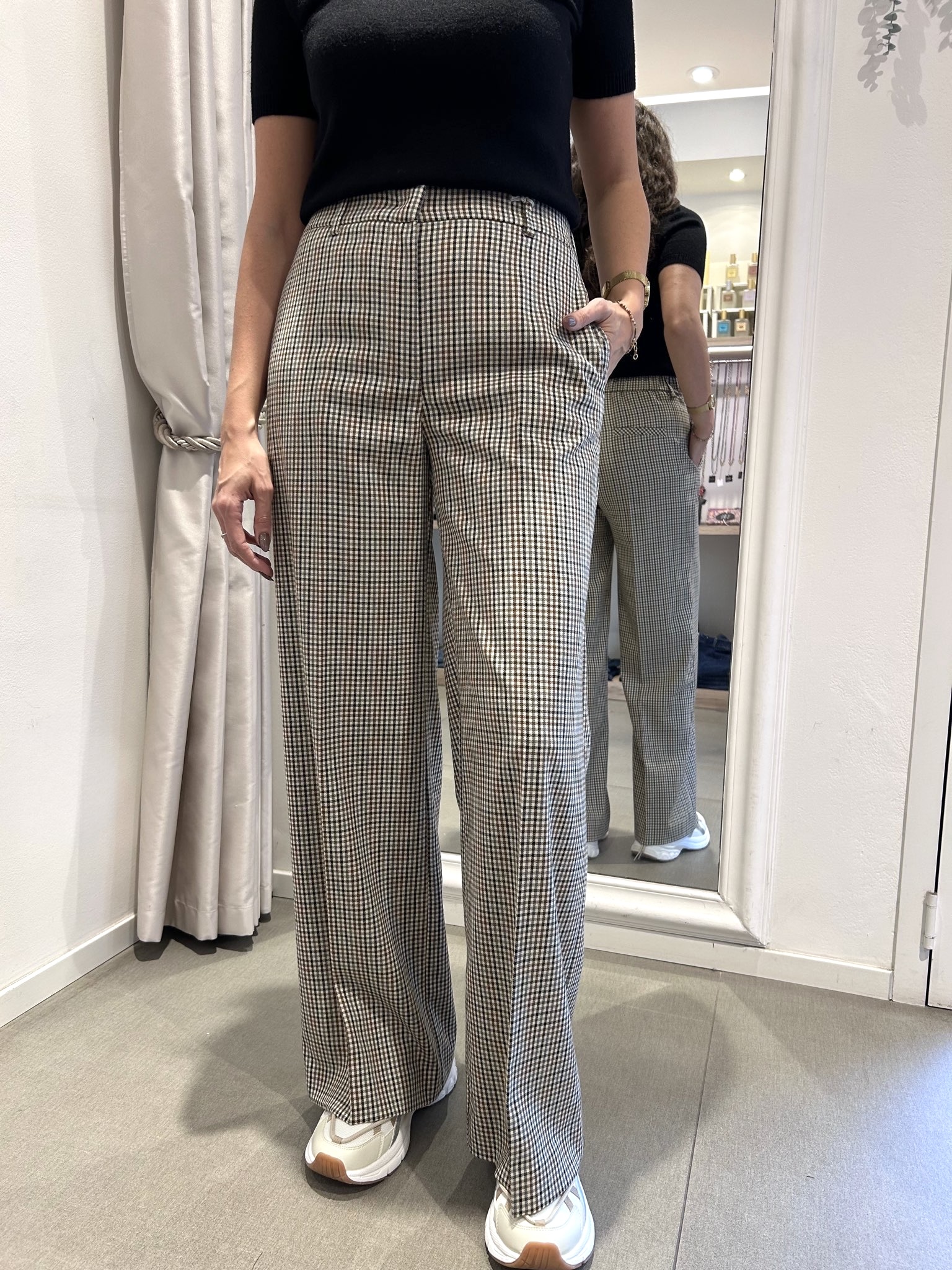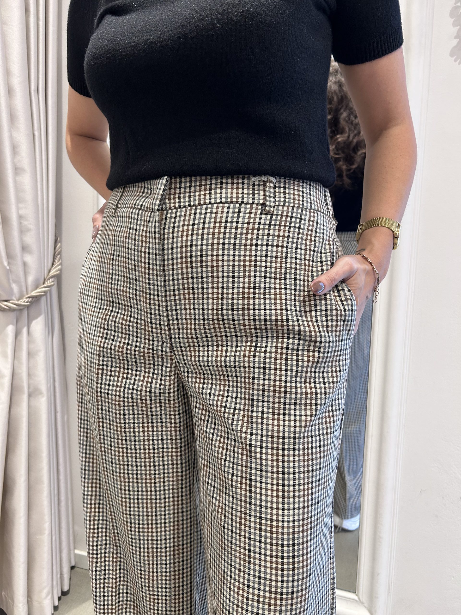 Pantalone stretch a fantasia micro quadretti con gamba larga, tasche laterali alla francese e chiusura con zip e gancetto.