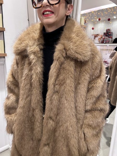 Ecopelliccia dalla linea dritta in color biscotto, chiusura con bottoni.