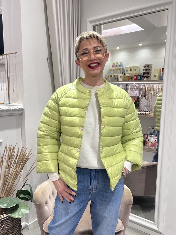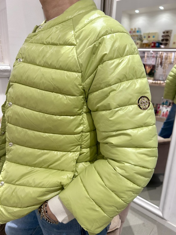 Piumino modello a cappetta, effetto trapuntato, collo alla coreana e maniche a 3/4, color lime. Due tasche sui lati, chiusura a bottoni automatici.