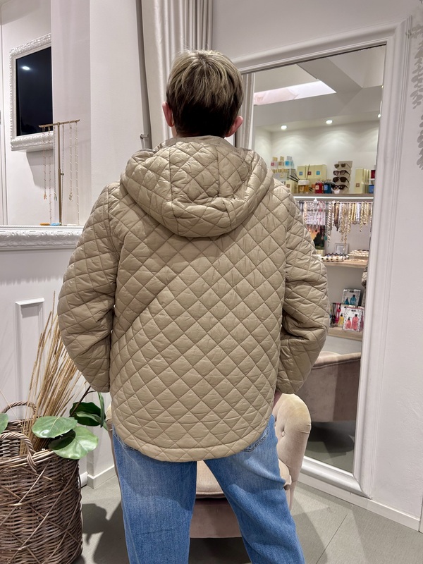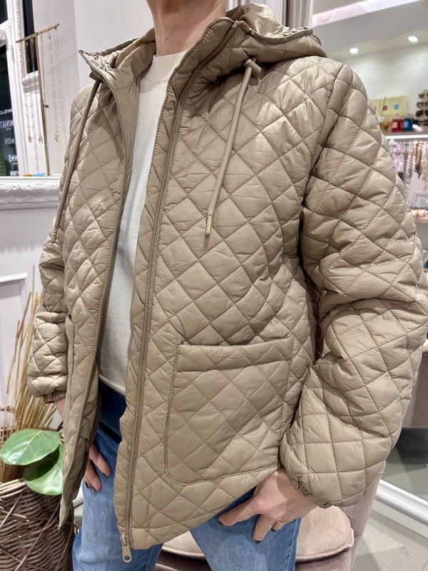 Piumino 100 grammi, trama trapuntata a rombi, color beige. Con cappuccio regolabile con coulisse e chiusura a zip.