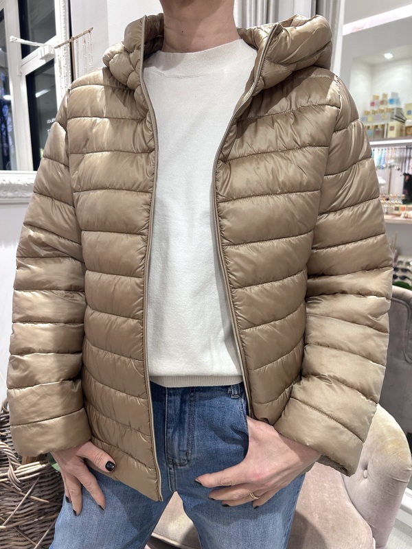 Piumino 100 grammi trapuntato, color beige, con cappuccio e chiusura con zip.