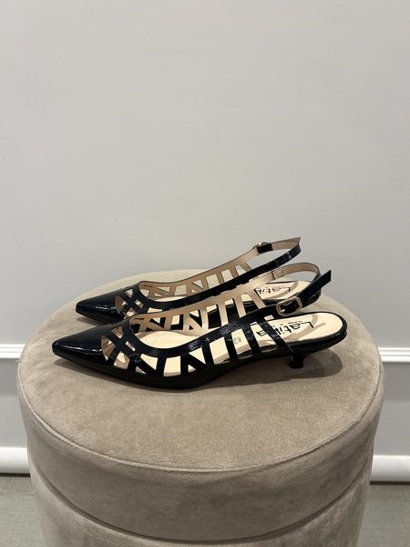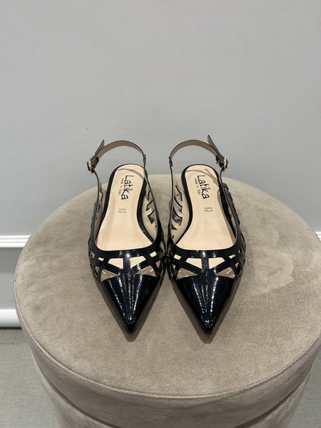 Ballerina slingback in ecopelle, con punta e motivo intrecciato, color nero. Chiusura con cinturino regolabile.