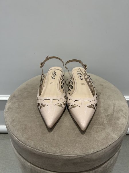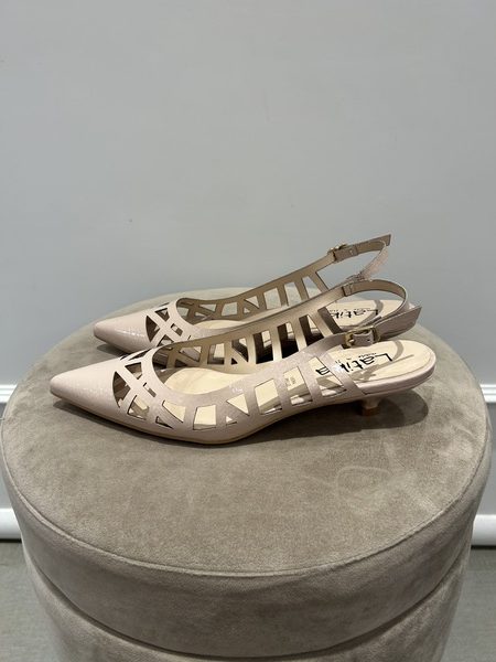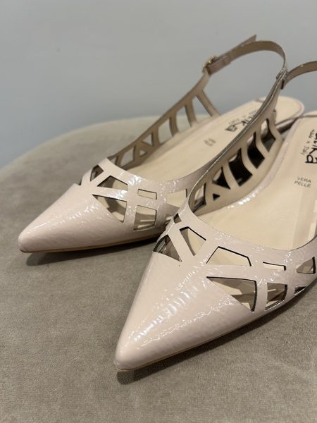 Ballerina slingback in ecopelle, con punta e motivo intrecciato, color nude. Chiusura con cinturino regolabile.
