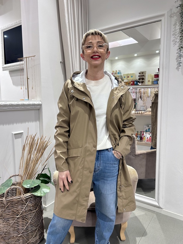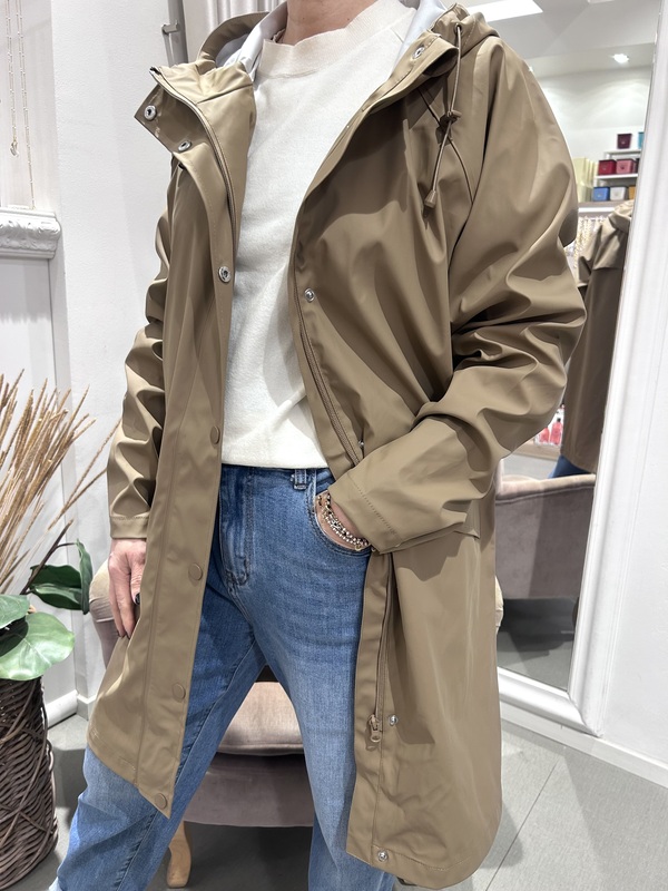 Spolverino impermeabile, modello lungo, color beige. Chiusura con zip e bottoni a pressione, ampie tasche e cappuccio con coulisse.