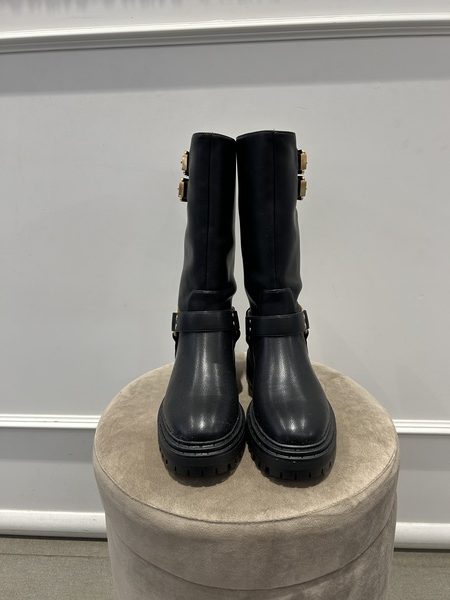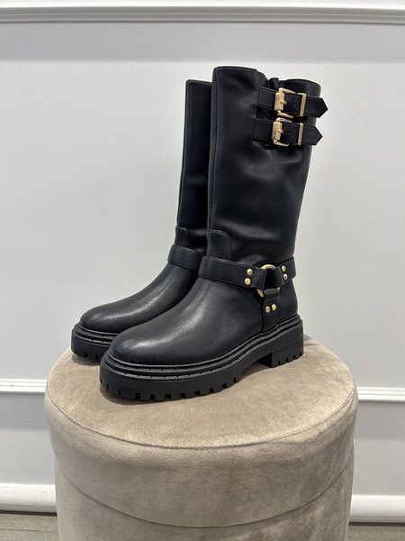 Stivali biker in pelle con fibbia e logo inciso in metallo dorato, punta tonda, chiusura laterale con fibbia e suola in gomma antiscivolo.