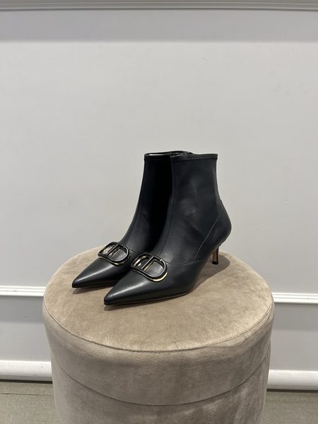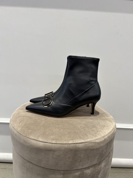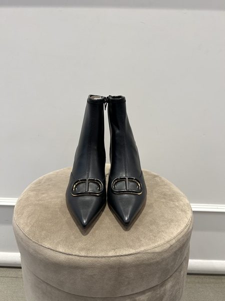 Stivaletti alla caviglia in pelle sintetica con inserto elasticizzato, Oval T smaltato in tinta, punta sfilata e chiusura con zip interna.