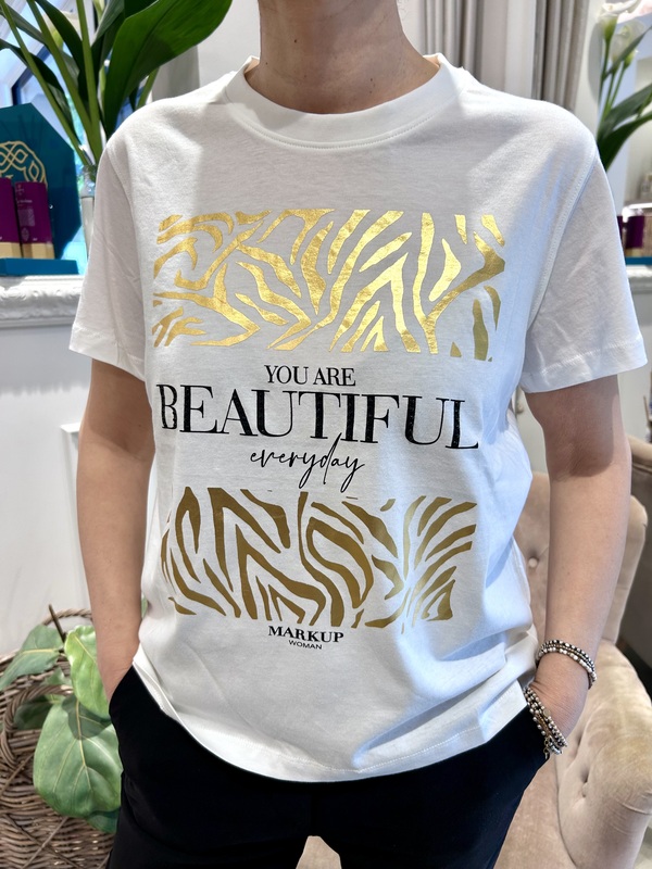 T-shirt girocollo in cotone con linea dritta, mainca corta e stampa frontale.